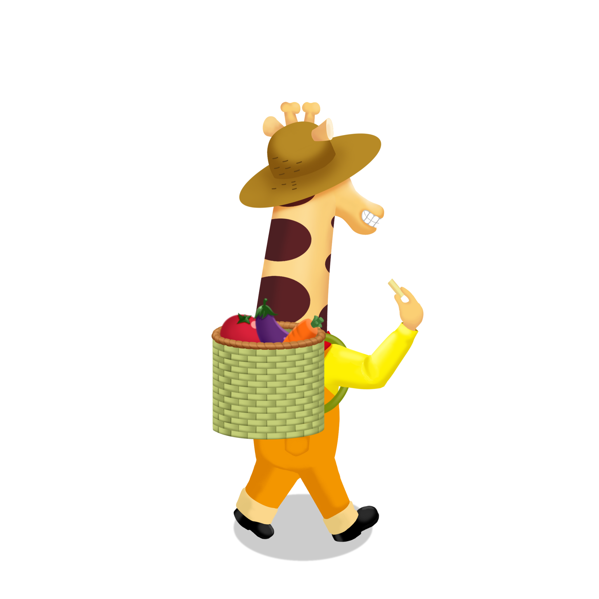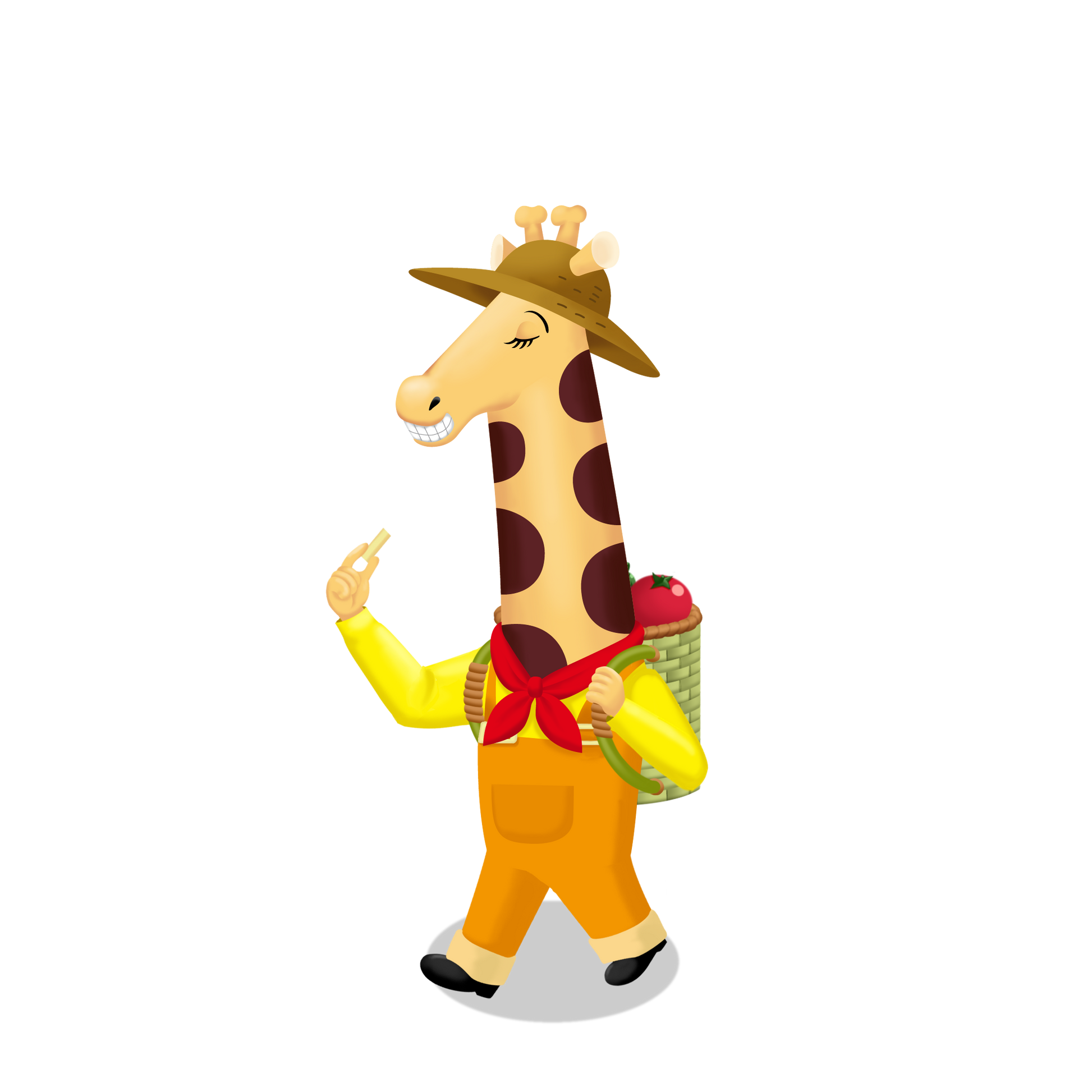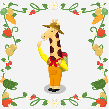 CalbeeFarmで野菜作りに励むじゃが作。籠には新鮮な野菜がたくさん!いっぱいお仕事頑張ったんだね!籠(かっこ)い~!豊作、豊作♪
