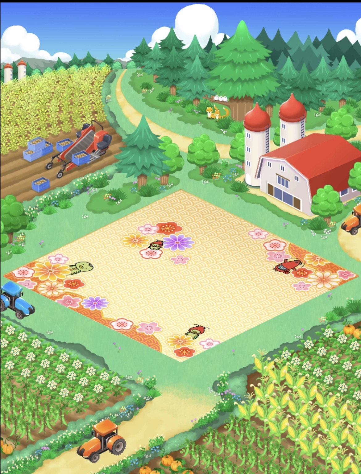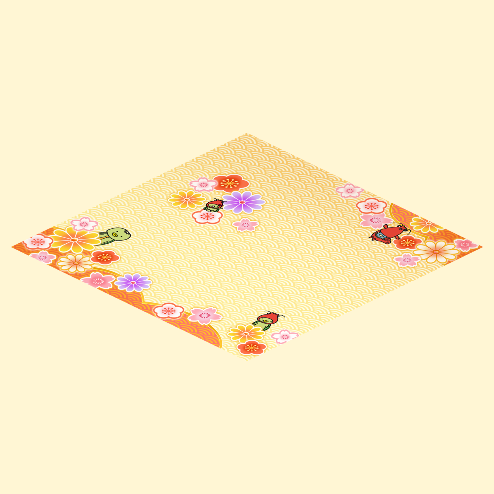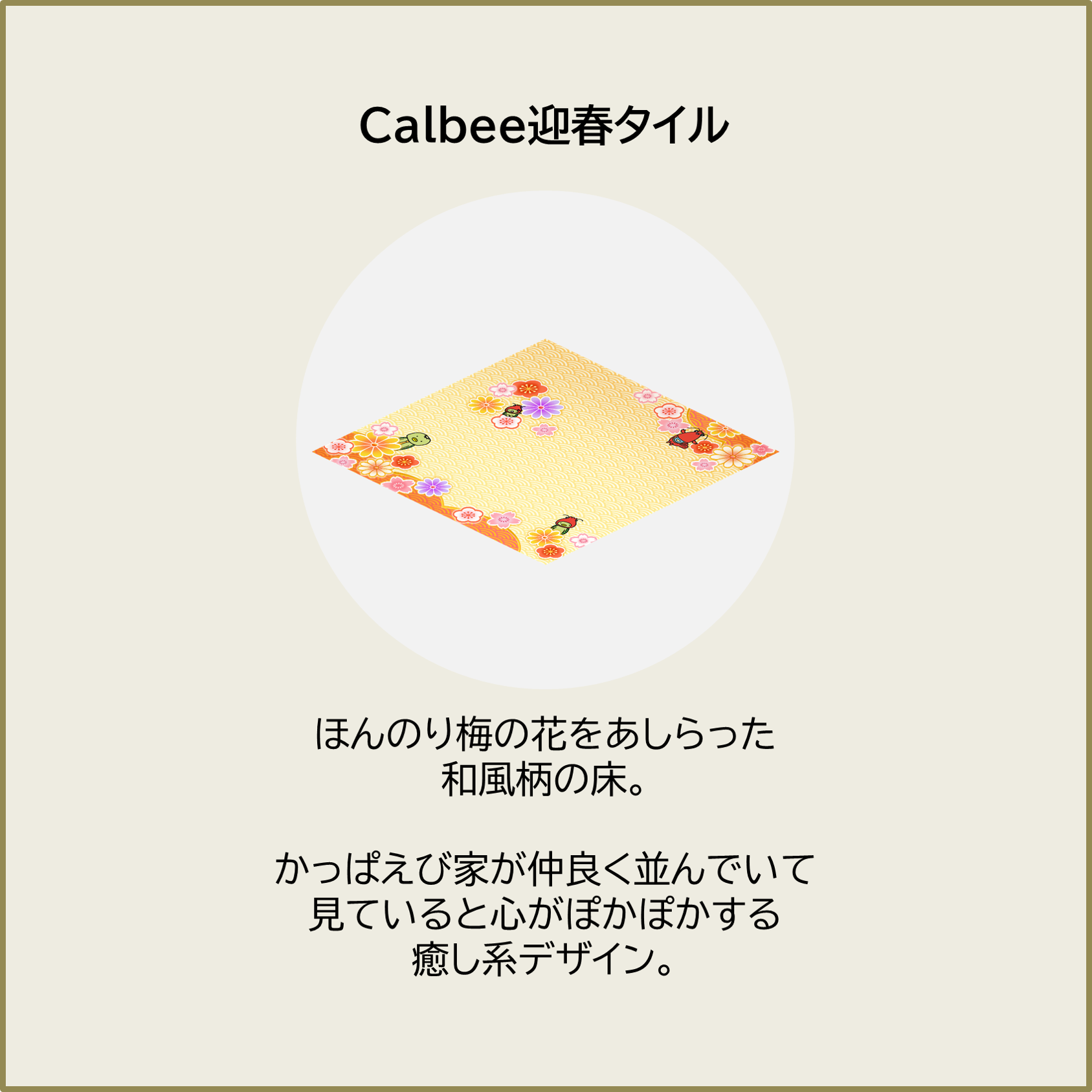 ほんのり梅の花をあしらった和風柄の床。かっぱえび家が仲良く並んでいて、見ていると心がぽかぽかする、癒し系デザイン。